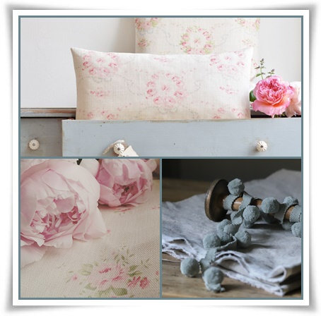 avec un lin crème, des petites roses fanées et des rubans gris brouillard !!